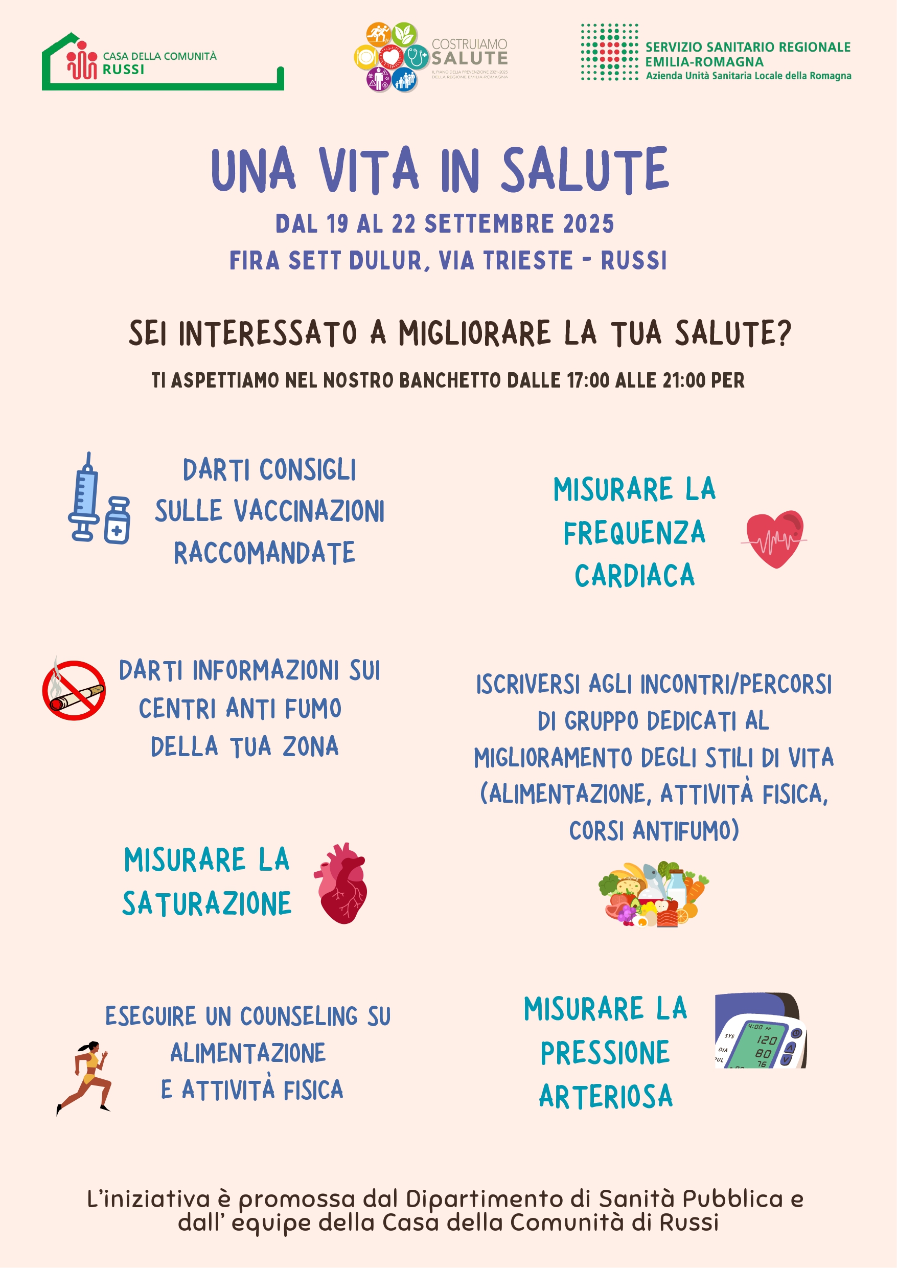 Se sei interessato a migliorare la tua salute, ti aspettiamo al nostro banchetto presso la Fira sett dulur per la misurazione di pressione arteriosa, frequenza cardiaca e saturazione, per valutare il tuo livello di dipendenza da nicotina, darti informazioni sui centri antifumo della tua zona, eseguire counselling su alimentazione e attività fisica e darti consigli sulle vaccinazioni raccomandate.