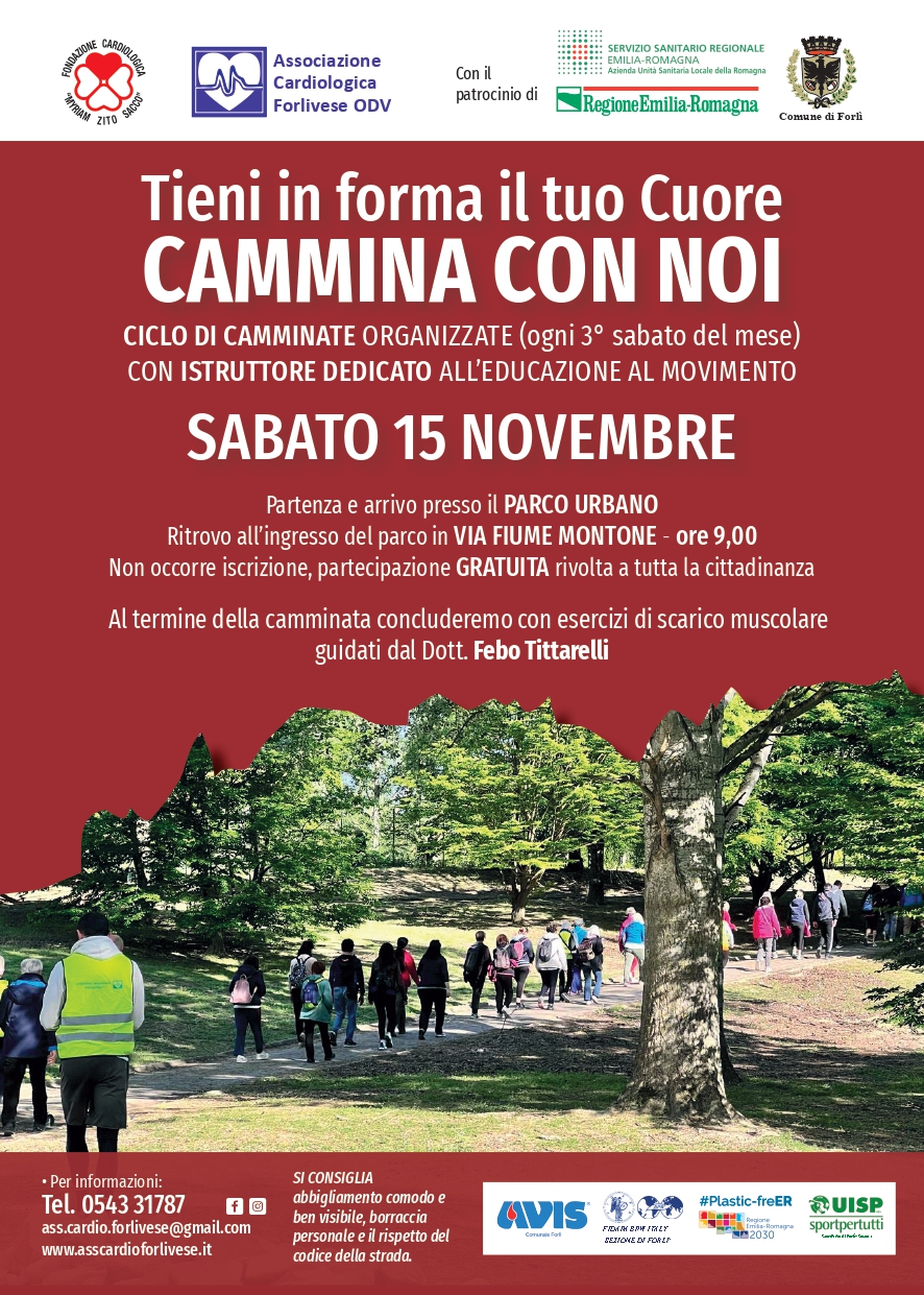Prosegue il progetto “Cammina Con Noi”, proposto dall’Associazione Cardiologica Forlivese ODV e dalla Fondazione Sacco, e patrocinato dall'Ausl Romagna, con una camminata che si svolgerà sabato 15 novembre, alle ore 9, presso il Parco Urbano Franco Agosto (partenza da via Fiume Montone), a Forlì. L'inziativa , gratuita e rivolta a tutta la cittadinanza, prevede l'ausilio di un istruttore dedicato all’educazione al movimento, attuata "a promuovere corretti stili di vita, benessere psicofisico e socialità, mantenendo le finalità di carattere medico sulla prevenzione Cardio-Vascolare".