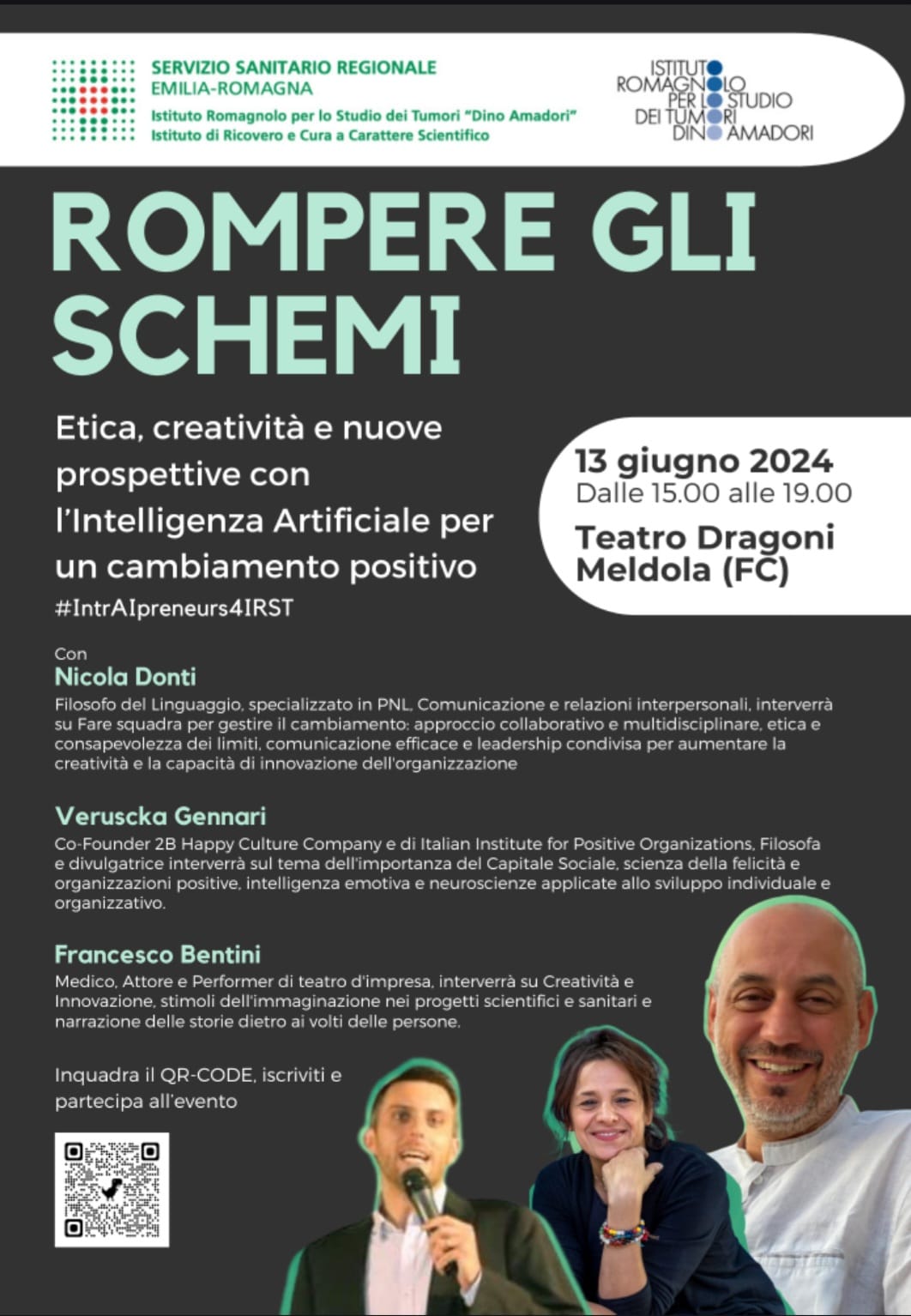 Ad aprire la giornata saranno i saluti istituzionali del Presidente di IRST "Dino Amadori" IRCCS, Fabrizio Miserocchi, e del Direttore Generale Lorenzo Maffioli. A seguire ci sarà l'intervento del dott. Bentini, che parlerà di creatività e innovazione e della narrazione nei progetti scientifici e sanitari. Sull'importanza del capitale sociale, sulla scienza della felicità e di organizzazioni positive discuterà invece la dott.ssa Gennari.