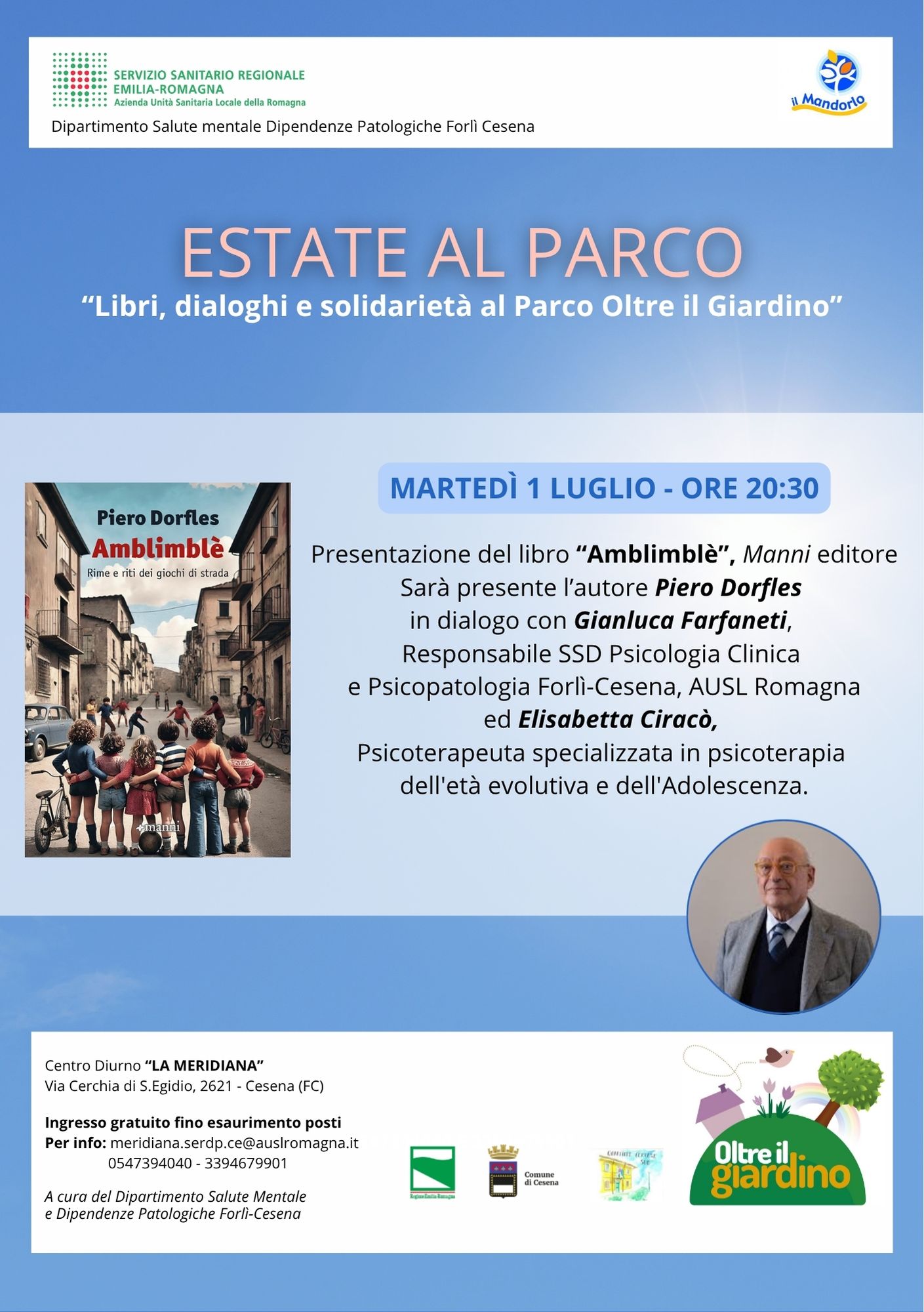 Secondo appuntamento martedì 1 luglio, alle ore 20.30 della rassegna letteraria gratuita ‘Estate al Parco’ al Centro Diurno La Meridiana di Cesena (Via Cerchia Sant’Egidio 262), con la presentazione del libro “Amblimblè” (Manni editore). Sarà presente l’autore Piero Dorfles in dialogo con Gianluca Farfaneti, responsabile SSD Psicologia Clinica e Psicopatologia Forlì-Cesena, AUSL Romagna ed Elisabetta Ciracò, psicoterapeuta specializzata in Psicoterapia dell'età evolutiva e dell'adolescenza.