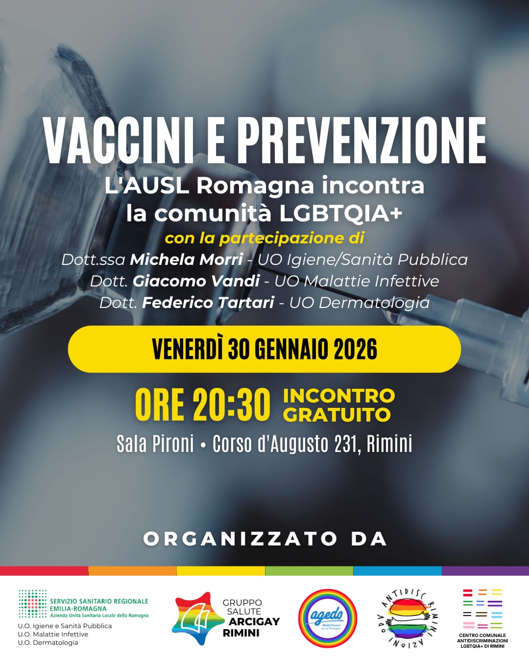 All’iniziativa gratuita, organizzata dalle Unità Operative Igiene/Sanità Pubblica, Malattie Infettive e Dermatologia di Rimini in collaborazione con Gruppo Salute Arcigay Rimini, Agedo e AntidiscRIMINIazioni Odv, prendono parte come relatori la dottoressa Michela Morri (U.O. Igiene/Sanità Pubblica) e i dottori Giacomo Vandi (U.O Malattie Infettive) e Federico Tartari (U.O. Dermatologia).