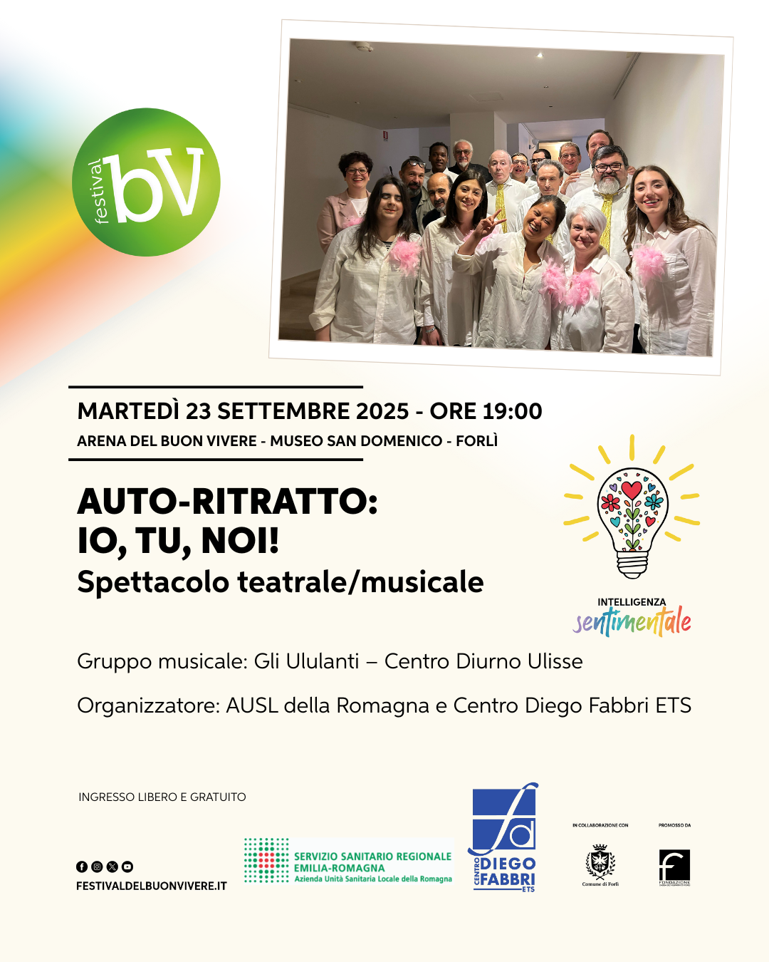 Nell'ambito della Settimana del Buon Vivere, che si terrà a Forlì dal 18 al 28 settembre, il Gruppo musicale Gli Ululanti del Centro Diurno Ulisse andranno in scena con lo spettacolo "Autoritratto: io, tu, noi", il 23 settembre, alle ore 19, presso la "Cittadella del Buon Vivere" ( Spazio antistante i Musei San Domenico, Forlì).