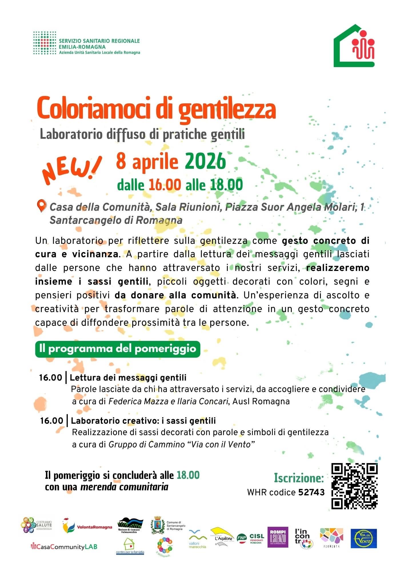 Il pomeriggio propone infatti un laboratorio per riflettere sulla gentilezza come gesto concreto di cura e vicinanza. Si partirà dalla lettura dei messaggi gentili lasciati dalle persone che hanno attraversato i servizi sanitari e sociali, primo momento a cura di Federica Mazza (psicologa di comunità dell’Ausl Romagna) e Ilaria Concari (UO Sanità Pubblica), per poi passare alla realizzazione insieme dei ‘sassi gentili’, piccoli oggetti decorati con colori, simboli e pensieri positivi, da donare alla comunità, a cura del Gruppo di Cammino ‘Via con il Vento’.