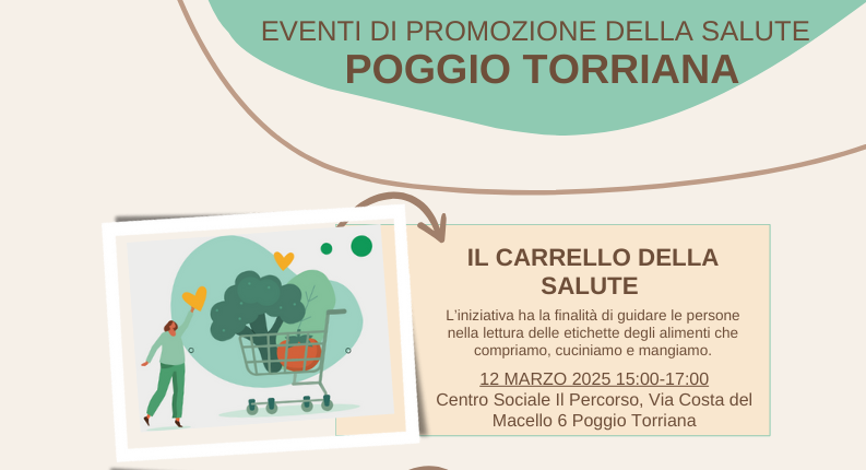In particolare mercoledì 12 marzo a Poggio Torriana, al Centro Sociale ‘Il Percorso’ (via Costa del Macello 6), si svolgerà dalle ore 15 alle 17 “Il Carrello della Salute – Le etichette”, iniziativa che ha la finalità di guidare le persone nella lettura delle etichette degli alimenti che compriamo, cuciniamo e mangiamo.