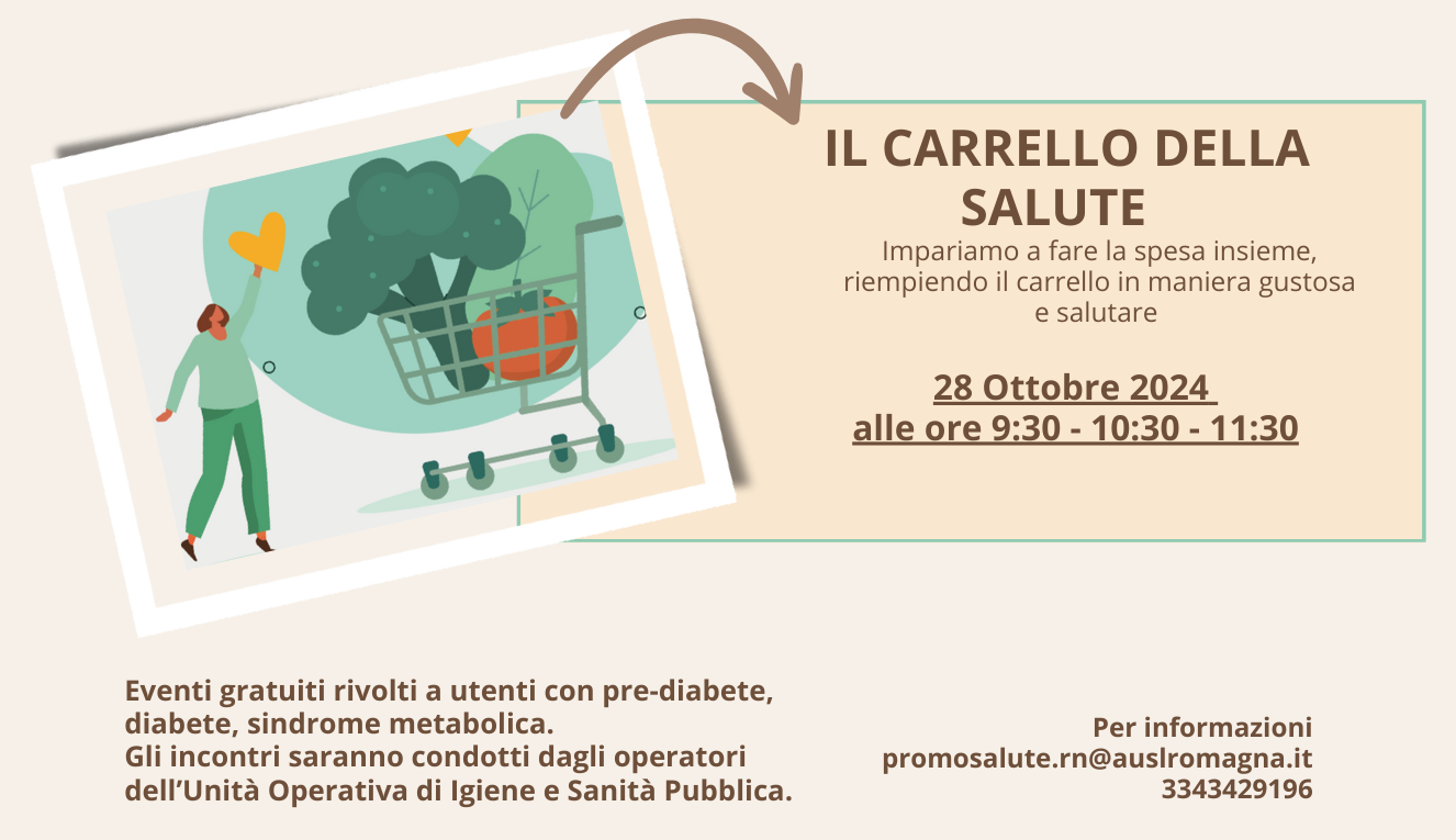 Lunedì 28 ottobre a Rimini, nell’Aula Modigliani della sede Ausl del Colosseo (Via Coriano 38, Scala C Piano Terra), è in programma l’evento gratuito “Il Carrello della salute”, con filo conduttore ‘Impariamo a fare la spesa insieme, riempiendo il carrello in maniera gustosa e salutare’.