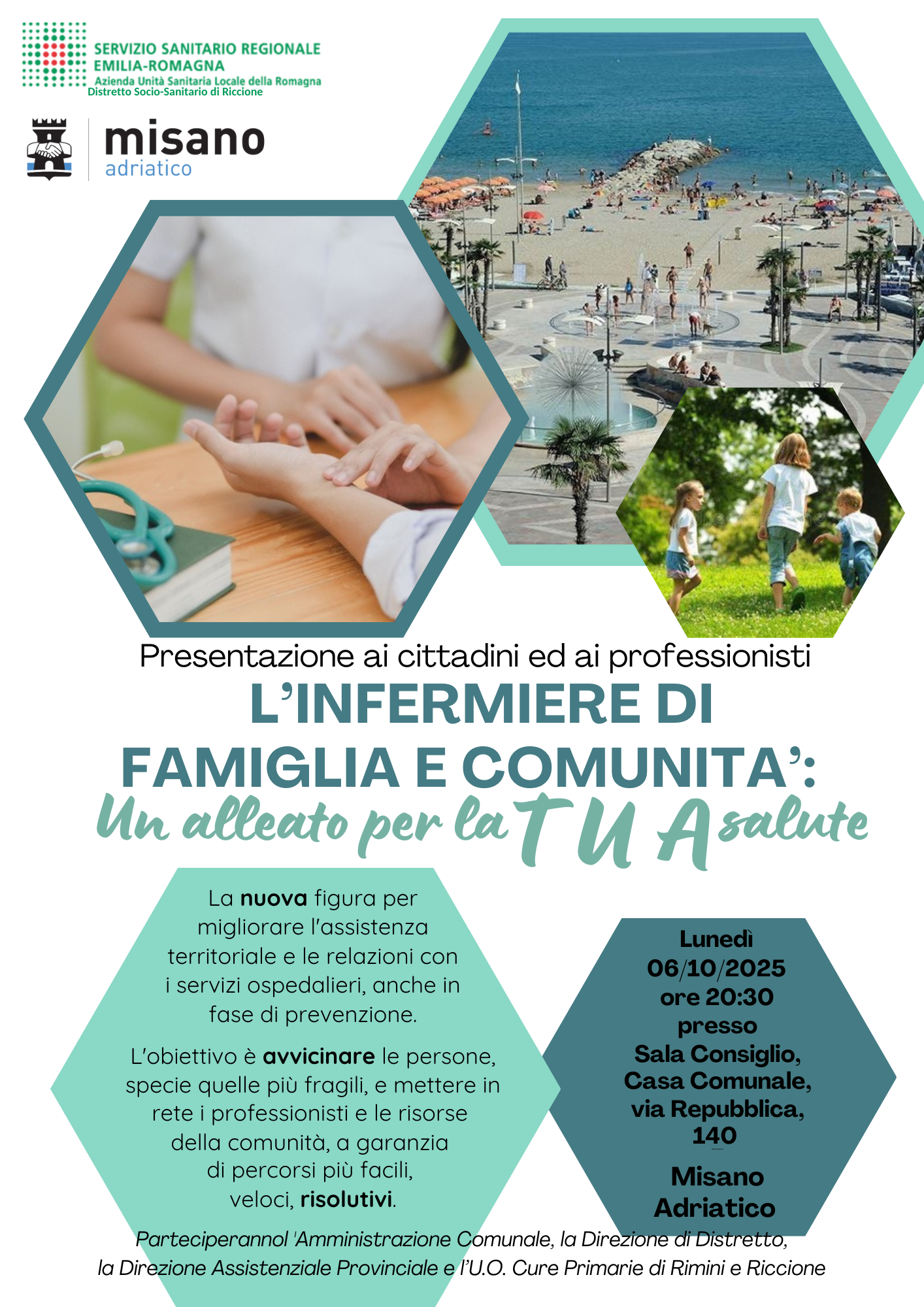 La sala del Consiglio comunale di Misano Adriatico ospiterà lunedì 6 ottobre alle 20.30 un incontro pubblico, promosso dall’amministrazione comunale e dall’Azienda sanitaria, al fine di illustrare i percorsi di cura, assistenziali e di prevenzione, erogati dall'Ausl della Romagna tramite servizi di prossimità.