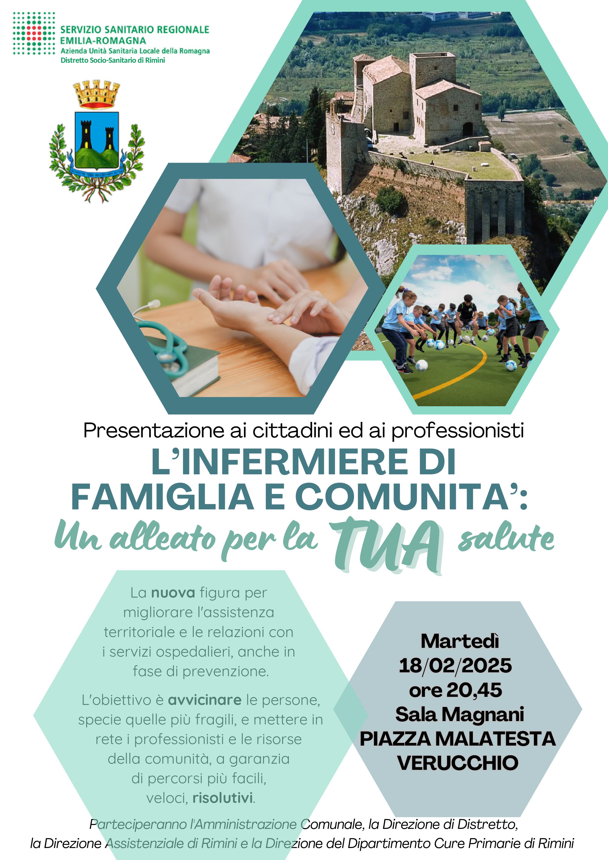 “L’Infermiere di Famiglia e Comunità: un alleato per la tua salute”: è il titolo dell’incontro pubblico, promosso dal Comune di Verucchio e dall’Ausl Romagna, in programma martedì 18 febbraio, alle ore 20.45, alla Sala Magnani di Verucchio (piazza Malatesta).