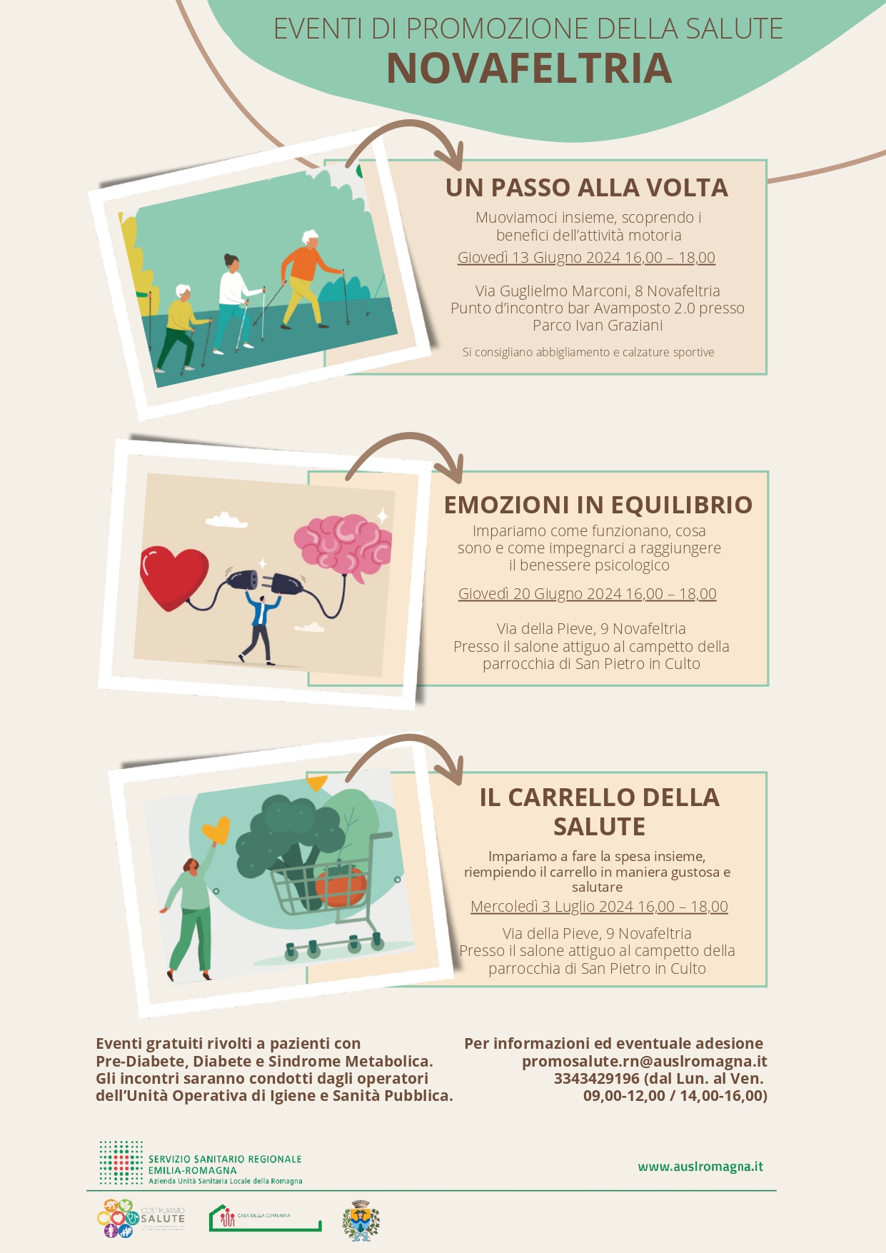 A Novafeltria sono poi in calendario altri due appuntamenti di promozione della salute: giovedì 20 giugno alle ore 16 “Emozioni in equilibrio”, e mercoledì 3 luglio sempre alle 16 “Il carrello della salute”.