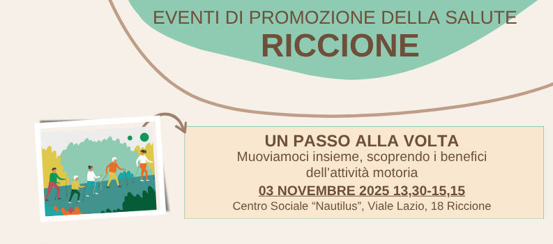 In particolare lunedì 3 novembre, dalle ore 13.30 alle 15.15, è in programma a Riccione, al Centro Sociale ‘Nautilus’ (viale Lazio 18), “Un passo alla volta”: si tratta di un incontro finalizzato a far conoscere ai cittadini i benefici dell’attività motoria e quanto sia importante contrastare la sedentarietà per mantenersi in salute in modo economico e divertente.