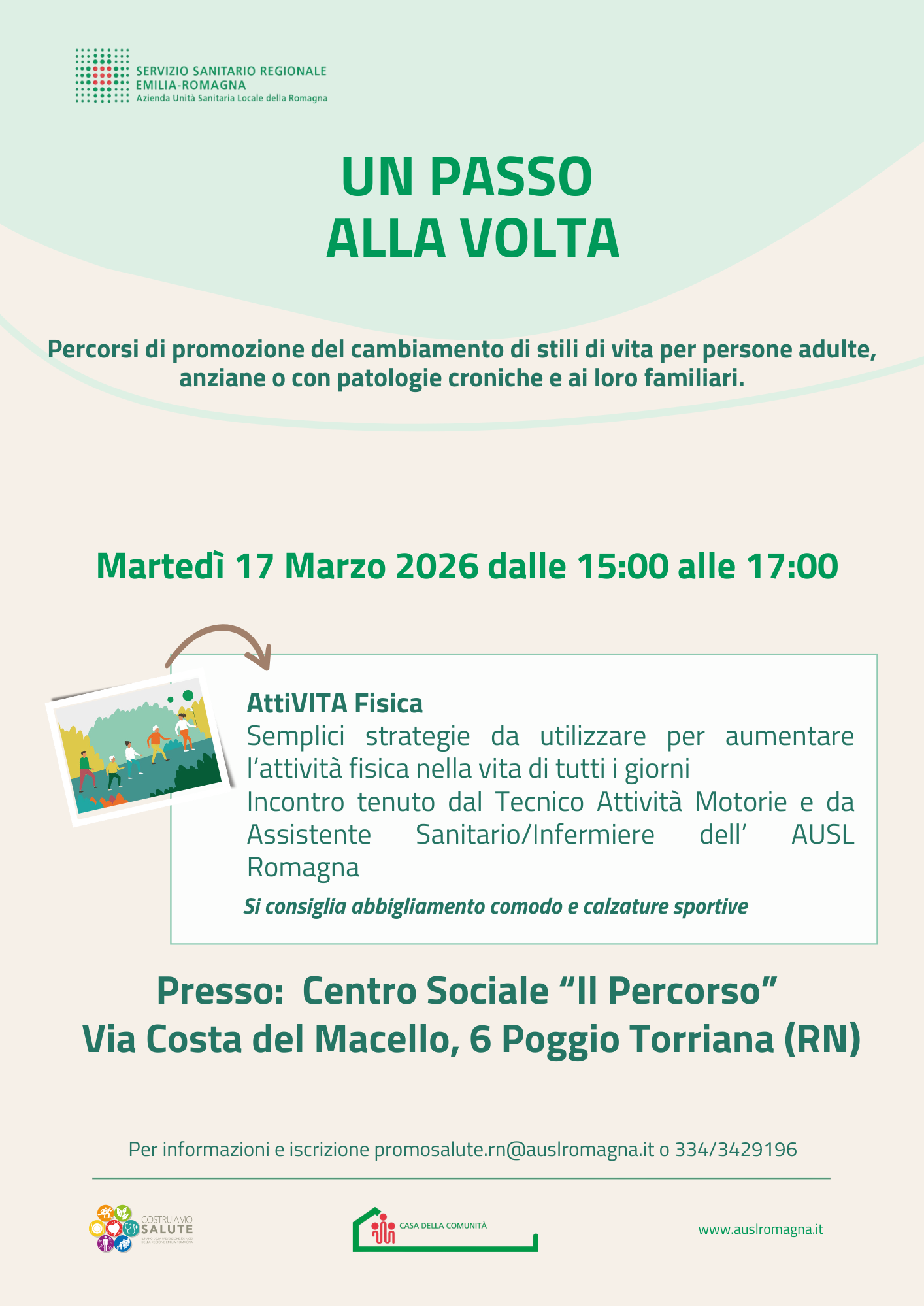 In particolare martedì 17 marzo a Poggio Torriana, al Centro Sociale ‘Il Percorso’ (via Costa del Macello 6), si svolgerà dalle ore 15 alle 17 “Un passo alla volta”: un incontro dedicato a semplici strategie per aumentare l’attività fisica nella vita di tutti i giorni, con una breve presentazione iniziale, seguita da esercizi pratici all’aperto e/o una camminata, per mettere subito in pratica quanto condiviso.