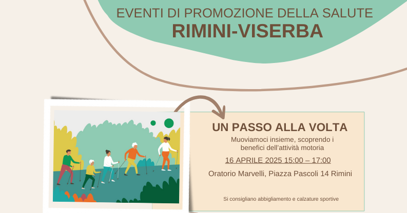 Mercoledì 16 aprile a Viserba (Rimini), all’Oratorio Marvelli (piazza Pascoli 14), si svolgerà dalle ore 15 alle 17 “Un passo alla volta”, l’iniziativa finalizzata a far conoscere ai cittadini i benefici dell’attività motoria e quanto sia importante contrastare la sedentarietà per mantenersi in salute in modo economico e divertente.