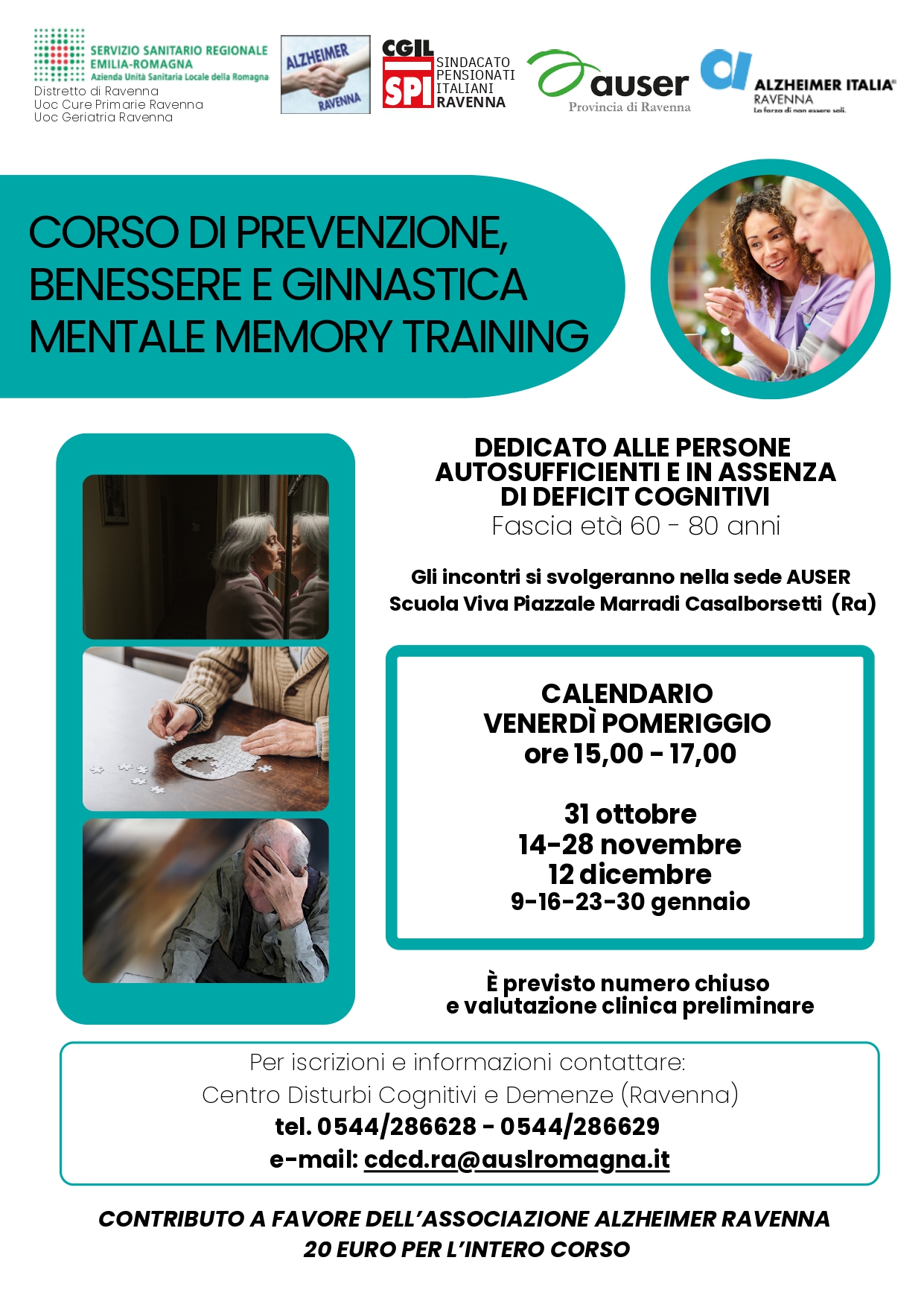 Per iscrizioni e informazioni contattare: Centro Disturbi Cognitivi e Demenze (Ravenna) tel. 0544/286628 - 0544/286629 e-mail: cdcd.ra@auslromagna.it