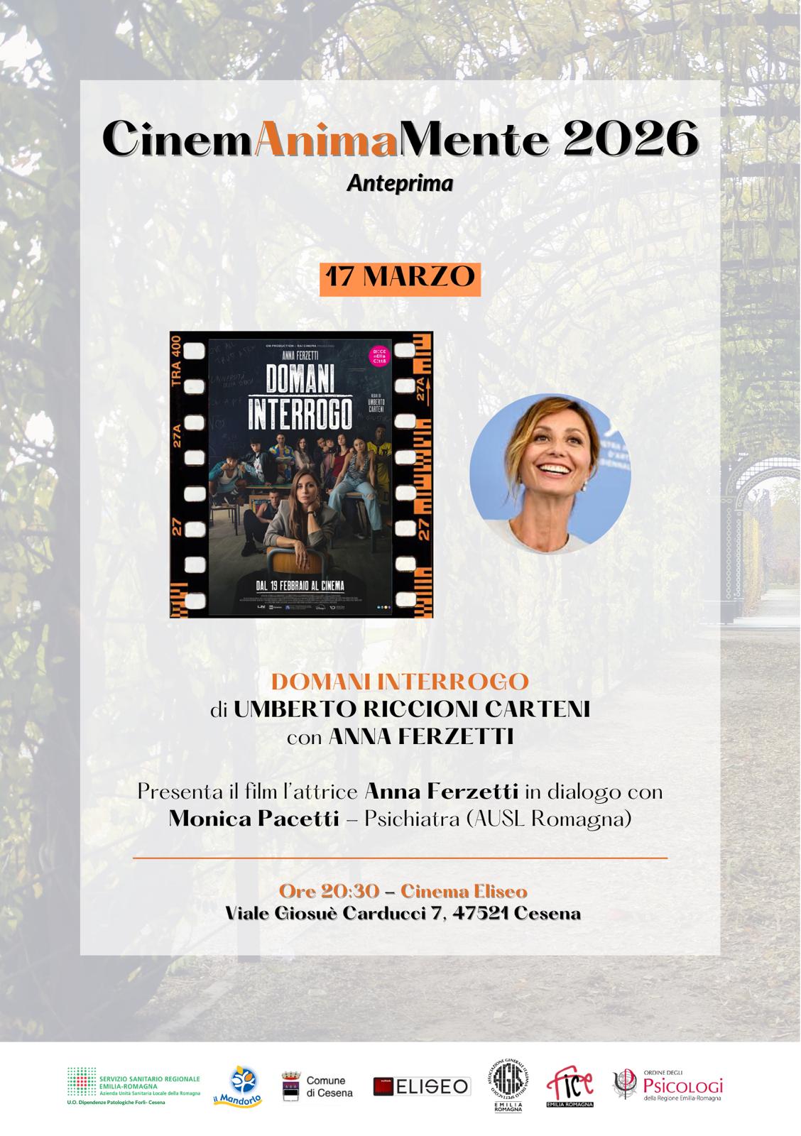 La rassegna CinemAnimaMente torna al Cinema Eliseo di Cesena con la pellicola “Domani Interrogo” di Umberto Riccioni Carteni. L’appuntamento, inizialmente previsto il 20 marzo, è stato anticipato a martedì 17 marzo, alle 20.30. Presenterà il film l’attrice Anna Ferzetti in dialogo con Monica Pacetti, psichiatria del Centro Salute Mentale Forlì Ausl Romagna.