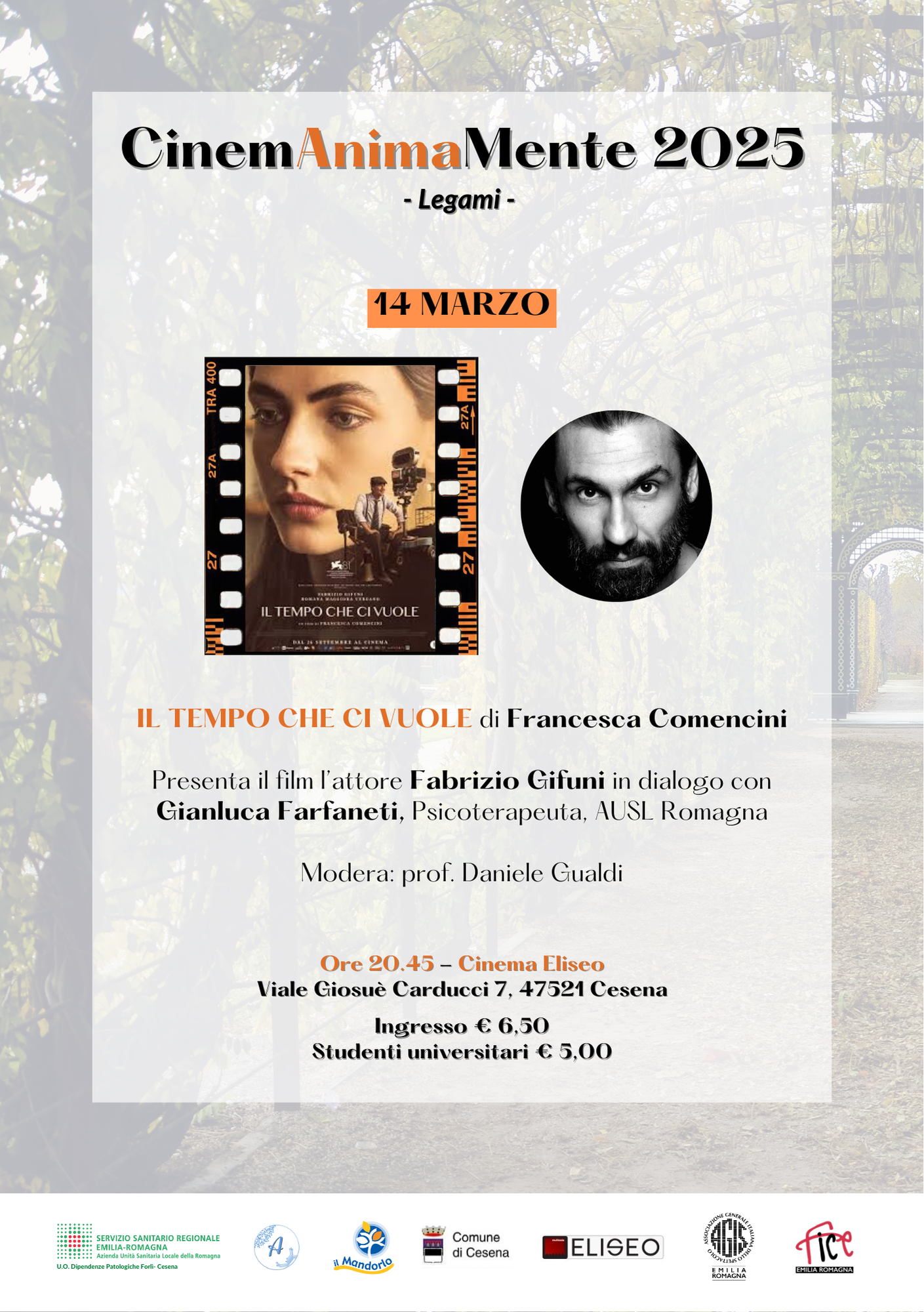 Penultimo appuntamento della rassegna CinemAnimaMente che venerdì 14 marzo, alle ore 20.45, torna al Cinema Eliseo di Cesena, con ‘Il tempo che ci vuole’, film di Francesca Comencini. In sala saranno presenti l’attore protagonista Fabrizio Gifuni in dialogo con il dottore Gianluca Farfaneti, psicologo, responsabile del servizio di Psicologa clinica e psicopatologia di Forlì Cesena-AUSL Romagna, l'Assessora ai Servizi per le persone e le famiglie Carmelina Labruzzo e l'assessore alla cultura Camillo Acerbi. A moderare la serata, il docente universitario prof. Daniele Gualdi.