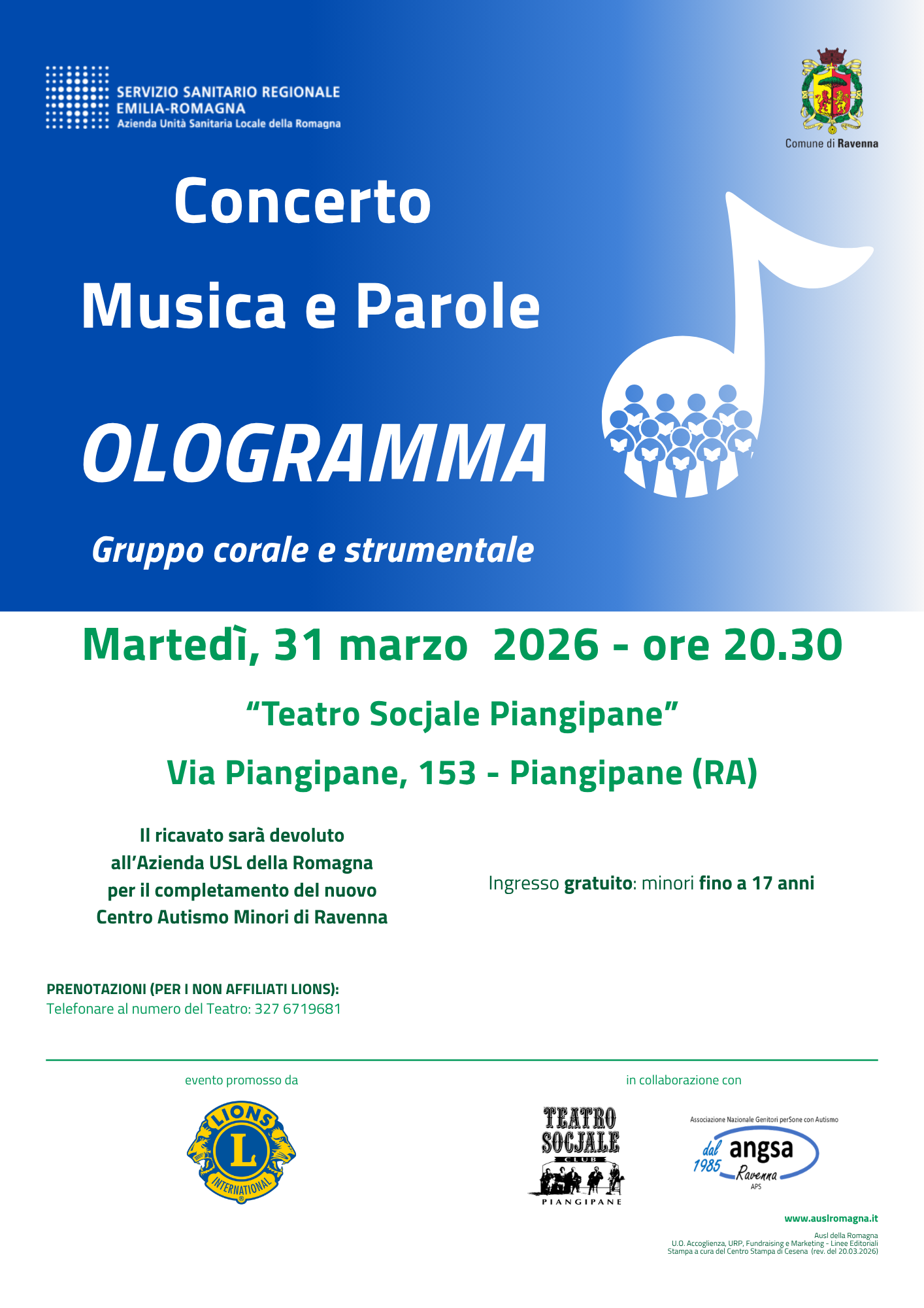 L’evento è promosso da Comune di Ravenna, AUSL Romagna, Lions club Ravenna Bisanzio in collaborazione con ANSGA Ravenna e Teatro Socjale e il ricavato sarà devoluto per il completamento del nuovo Centro Autismo Minori di Ravenna di AUSL Romagna.