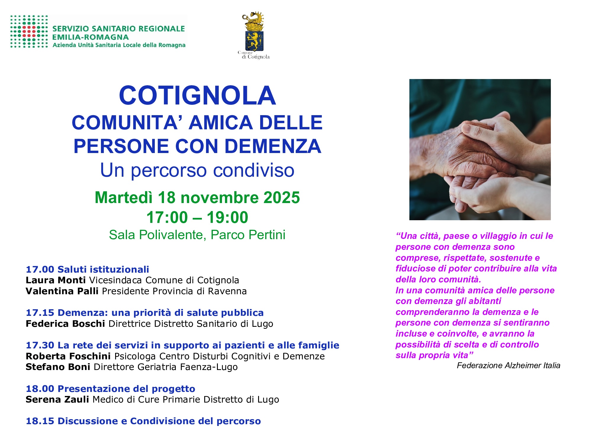 La percentuale di persone con demenza tra gli ultrasessantacinquenni è del 5,59% . Nel territorio dell’AUSL Romagna si stima la presenza di 15.826 persone con demenza di cui oltre 5000 residenti in provincia di Ravenna. Per tale motivazioni diventa sempre più urgente creare comunità accoglienti ed in grado di supportare le persone con demenza ed i loro caregiver. Questo è possibile grazie al lavoro congiunto tra AUSL, Associazioni ed Enti Locali al fine formare, sensibilizzare, combattere lo stigma e creare percorsi facilitati. Nell’ambito del Distretto di Lugo è stato avviato il percorso della “Comunità Amica delle Persone con Demenza” nel Comune di Cotignola.