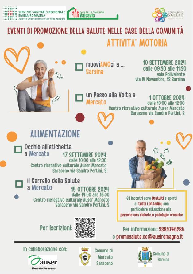 A Mercato Saraceno sono in programma 3 eventi che si svolgeranno al Centro ricreativo culturale Auser (via Sandro Pertini, 3): martedì 17 settembre, dalle 10 alle 12, “Occhio all’etichetta” per approfondire i temi di una sana alimentazione e imparare a leggere l’etichetta dei cibi; martedì 1 ottobre dalle ore 10 alle 12, “Un passo alla volta” con una passeggiata insieme al Tecnico delle Attività Motorie dell’AUSL; martedì 15 ottobre dalle 14 alle 16, “Il carrello della salute” per imparare a fare la spesa riempiendo il carrello in maniera gustosa e salutare.
