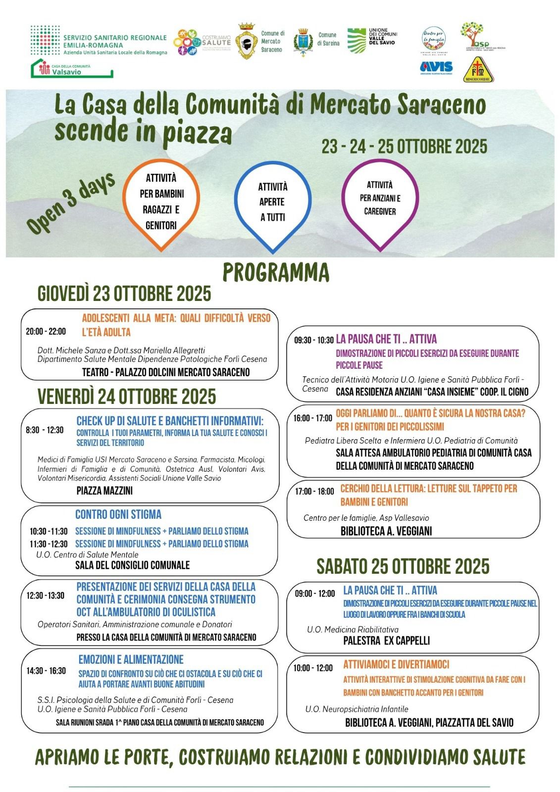 Dal 23 al 25 ottobre la Casa della Comunità di Mercato Saraceno scende in piazza coi suoi operatori per tre giorni di check up di salute, dimostrazioni, incontri e diverse attività per bambini e ragazzi, genitori, anziani e caregiver.