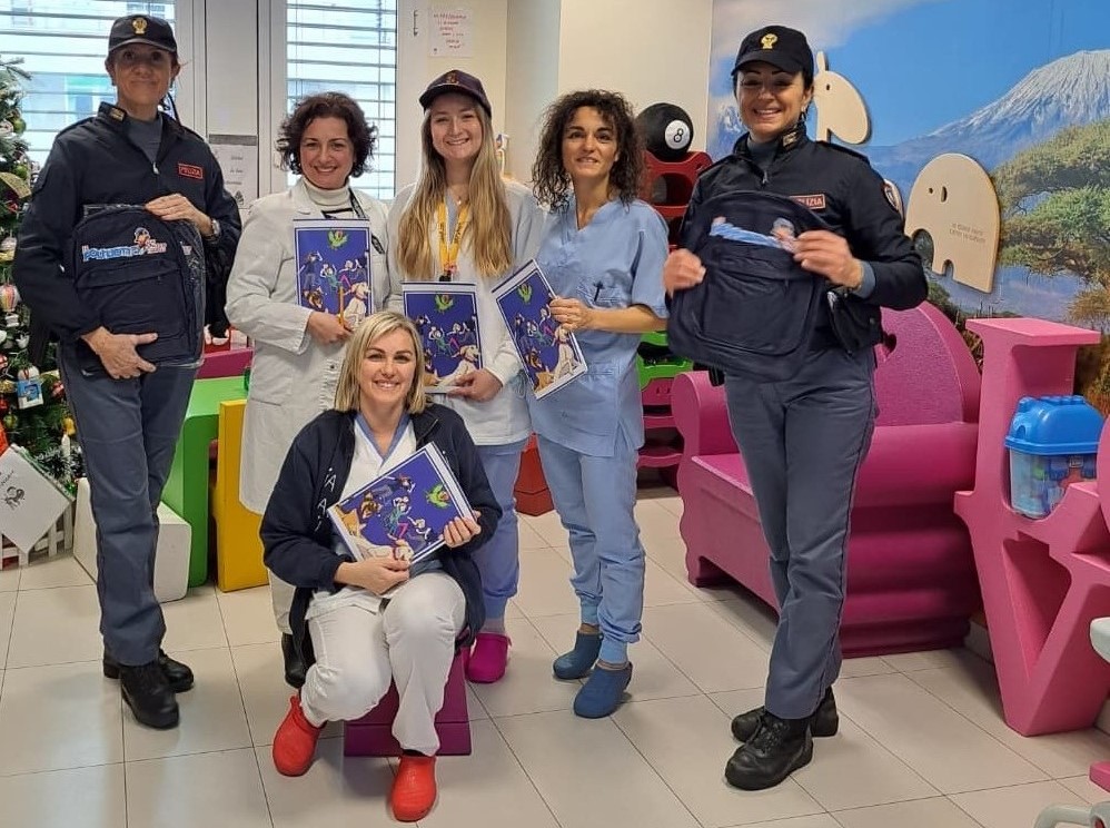 Ad accogliere la delegazione della Polizia la dottoressa Gabriella Pelusi insieme ad altri medici e infermieri del reparto che ha ricevuto i doni da consegnare ai bambini, così da regalare un sorriso a chi è in ospedale per motivi di salute.