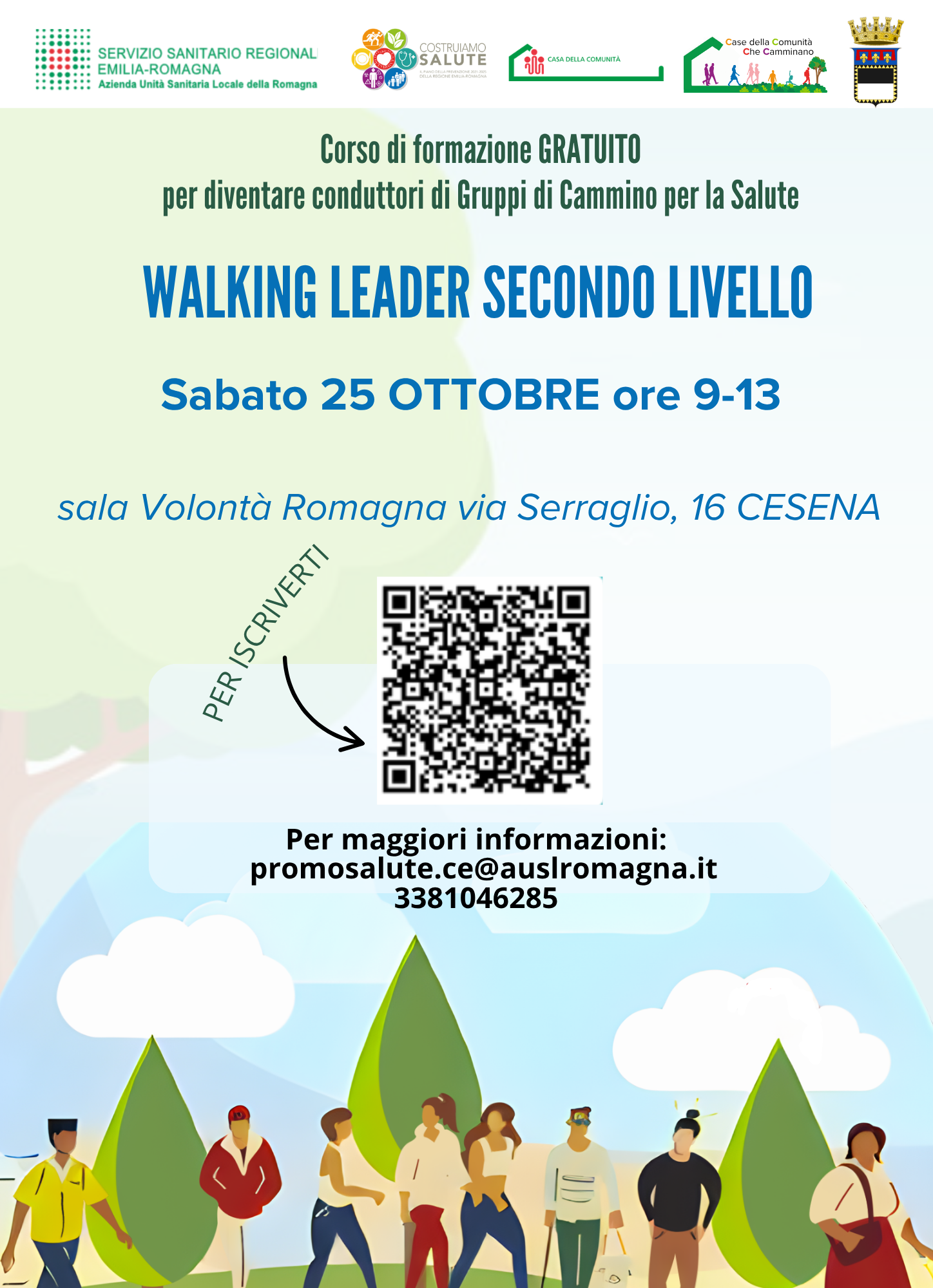 Proseguono le iniziative formative rivolte ai conduttori di gruppi di cammino nella provincia di Forlì-Cesena. Sono aperte le iscrizioni per partecipare al nuovo corso gratuito di Secondo Livello per “Conduttori di Gruppi di Cammino per la Salute” che si svolgerà a Cesena sabato 25 ottobre dalle ore 9 alle 13, nella sala Volontà Romagna di via Serraglio 16.