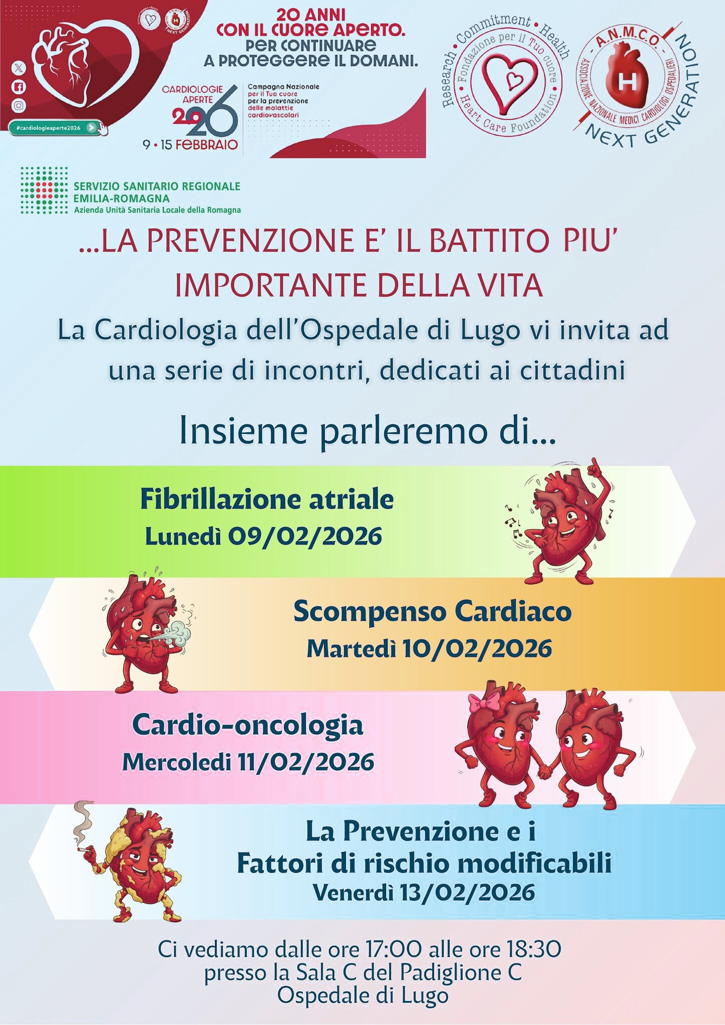 Nell'ambito della Settimana "per il tuo Cuore" , che si svolgerà dal 9 febbraio al 15 febbraio promossa, come ogni anno, dalla Fondazione Per il tuo Cuore, la Cardiologia dell'Ospedale Umberto I di Lugo organizzerà 4 incontri rivolti alla popolazione, che si svoleranno nella Sala C del padiglione C dalle ore 17 alle 18,30