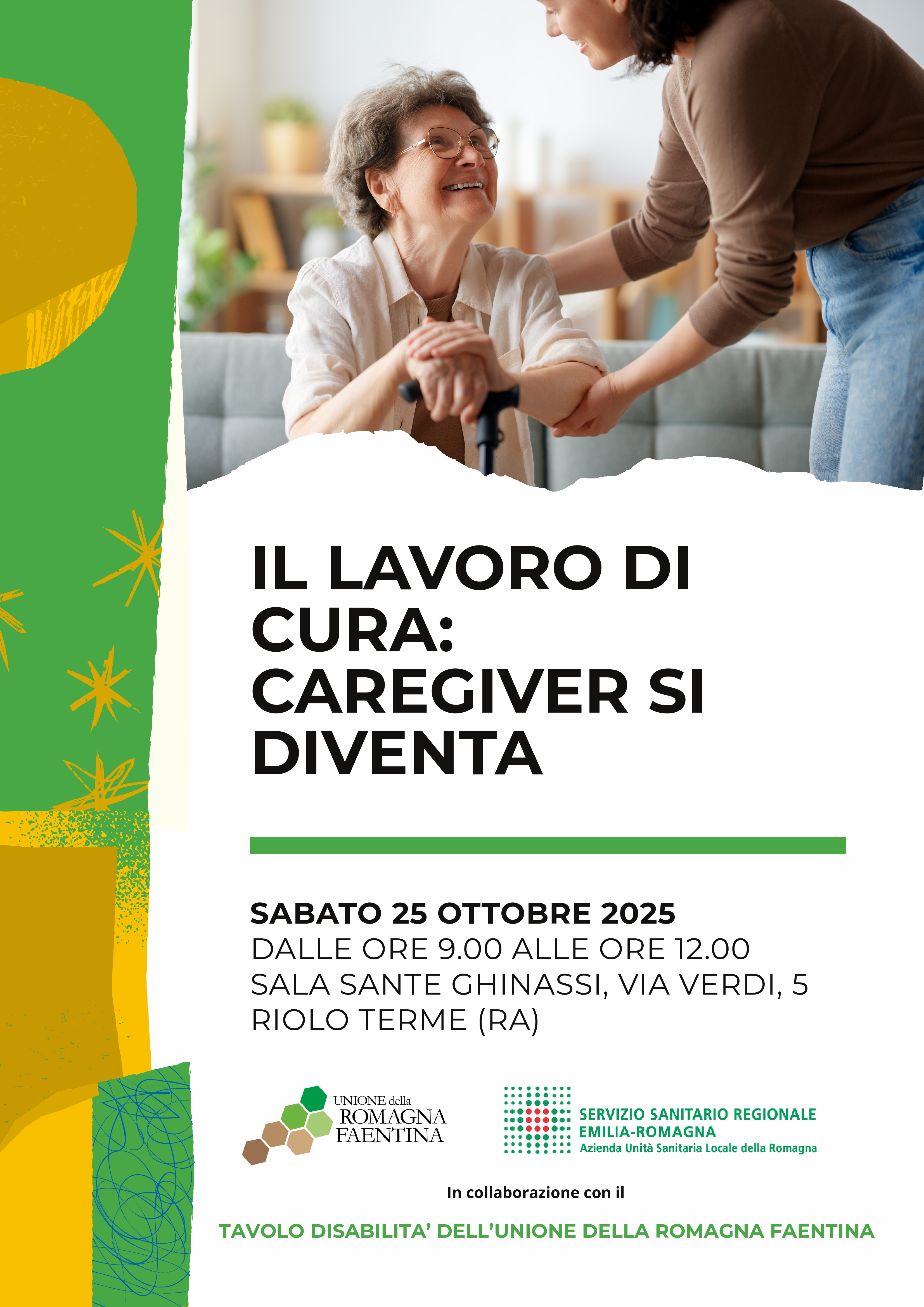 L'Unione della Romagna Faentina e Ausl Romagna, in collaborazione con il Tavolo Disabilità dell’Unione, organizzano l’incontro pubblico “Il lavoro di cura: Caregiver si diventa”, in programma sabato 25 ottobre 2025, dalle 9 alle 12, nella Sala Sante Ghinassi in via Verdi 5 a Riolo Terme.