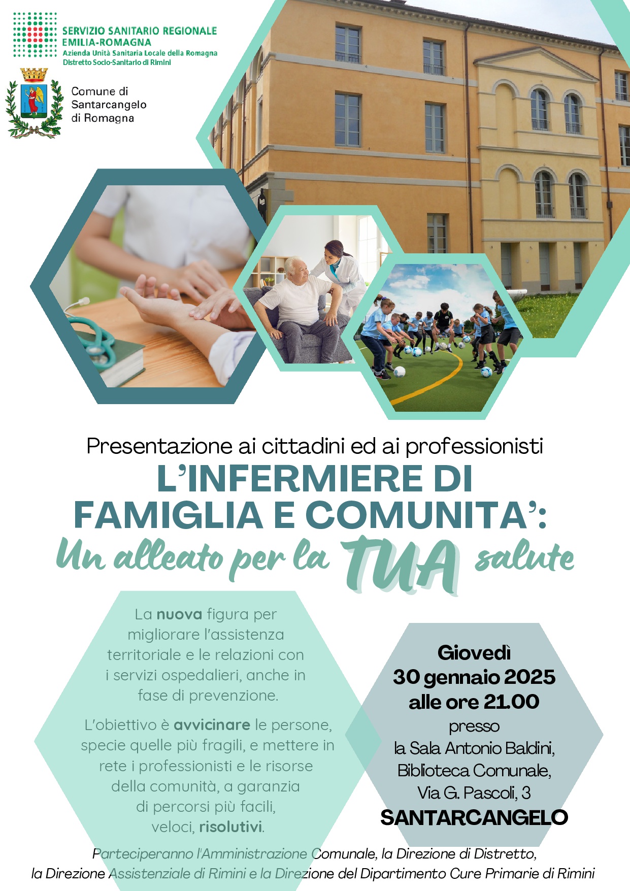 Sarà presentato alla cittadinanza giovedì 30 gennaio, alle ore 21, nella sala Baldini della biblioteca l'Infermiere di Famiglia e Comunità, nuovo servizio in corso di attivazione da parte di Ausl Romagna anche per il territorio comunale di Santarcangelo. All’incontro parteciperanno rappresentanti dell’Amministrazione comunale, la direzione del Distretto, la direzione assistenziale e la direzione del Dipartimento Cure Primarie di Rimini.