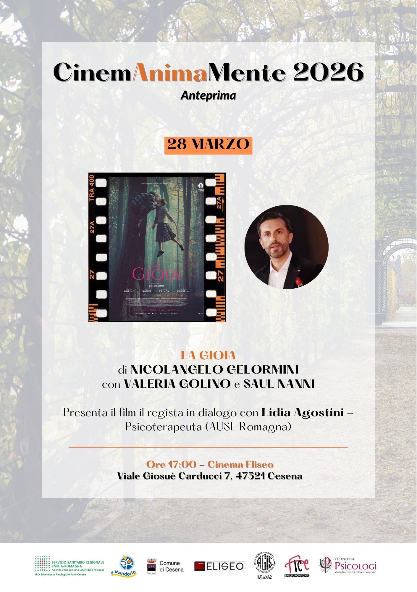 L’appuntamento finale è sabato 28 marzo alle ore 17 al Cinema Eliseo di Cesena, con la proiezione della pellicola “La Gioia” di Nicolangelo Gelormini.