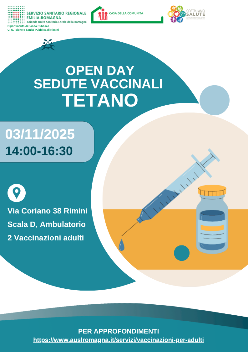 Lunedì 3 novembre, dalle ore 14 alle 16.30, all’Ambulatorio Vaccinazioni Adulti di Rimini (sede Ausl Colosseo, via Coriano 38, scala D), si svolgeranno nuove sedute vaccinali straordinarie ad accesso libero per chi non è mai stato vaccinato contro il tetano, o chi non fa richiami da più di dieci anni, promosse dal Servizio di Igiene e Sanità Pubblica dell’Ausl Romagna.