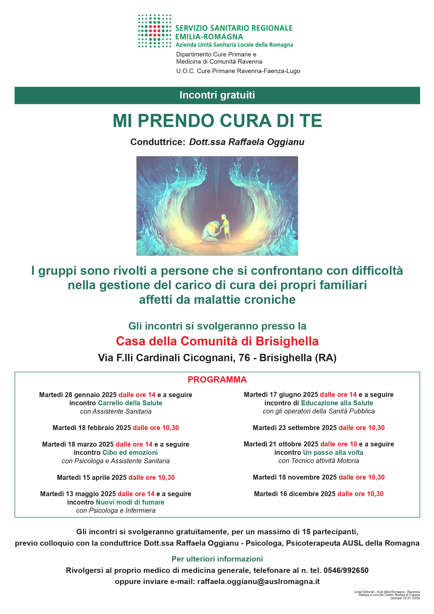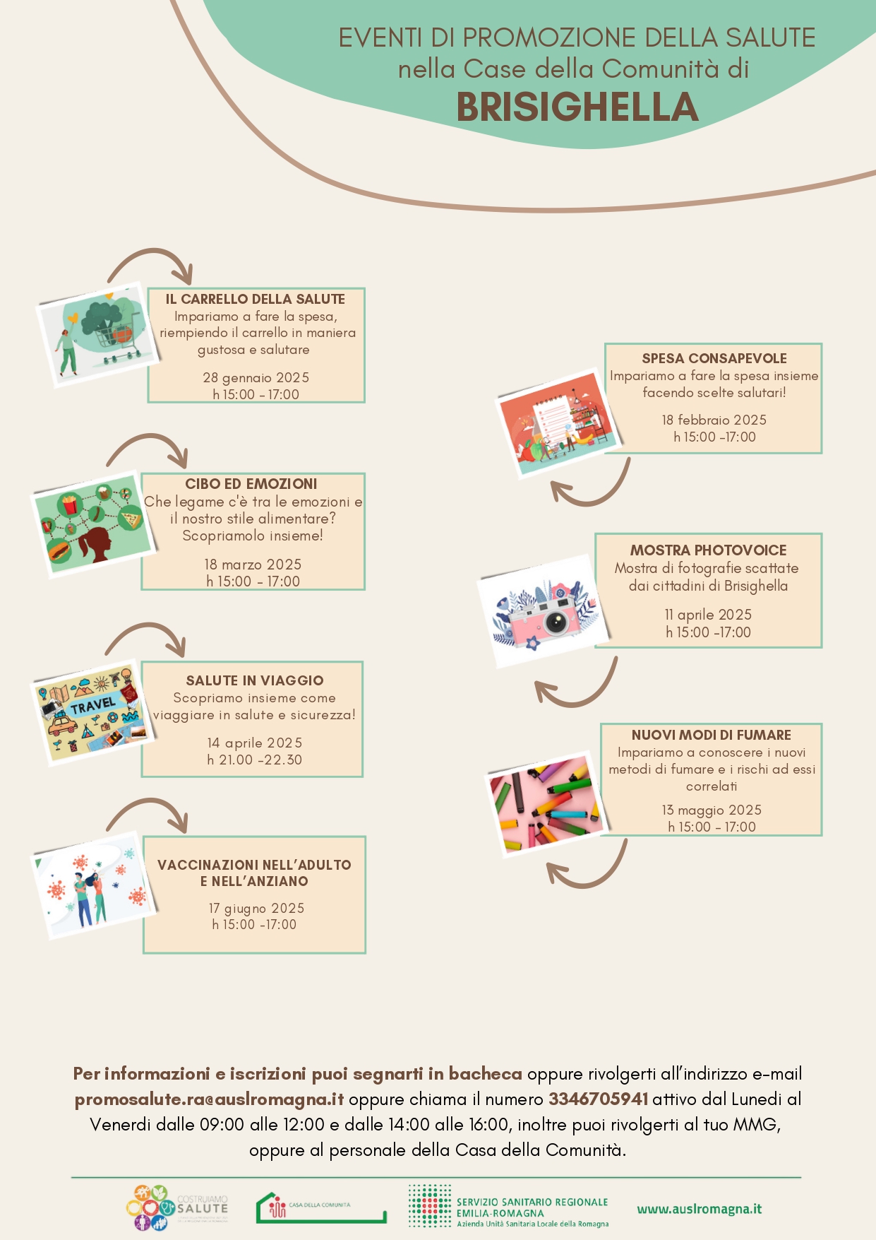 Tutti gli incontri si svolgeranno alla Casa della Comunità, in via Fratelli Cardinali Cicognani, 76 a Brisighella.