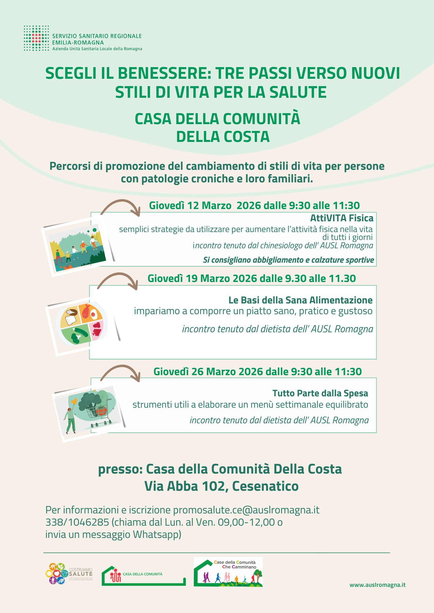 Gli eventi sono organizzati dal Dipartimento di Sanità Pubblica in collaborazione con le Case della Comunità dei Distretti di Cesena Valle Savio e Rubicone. La partecipazione è gratuita, ma è necessaria l’iscrizione. Si può scrivere all’indirizzo e-mail promosalute.ce@auslromagna.it oppure telefonare al numero 3381046285 attivo dal lunedì al venerdì dalle 9 alle 12.