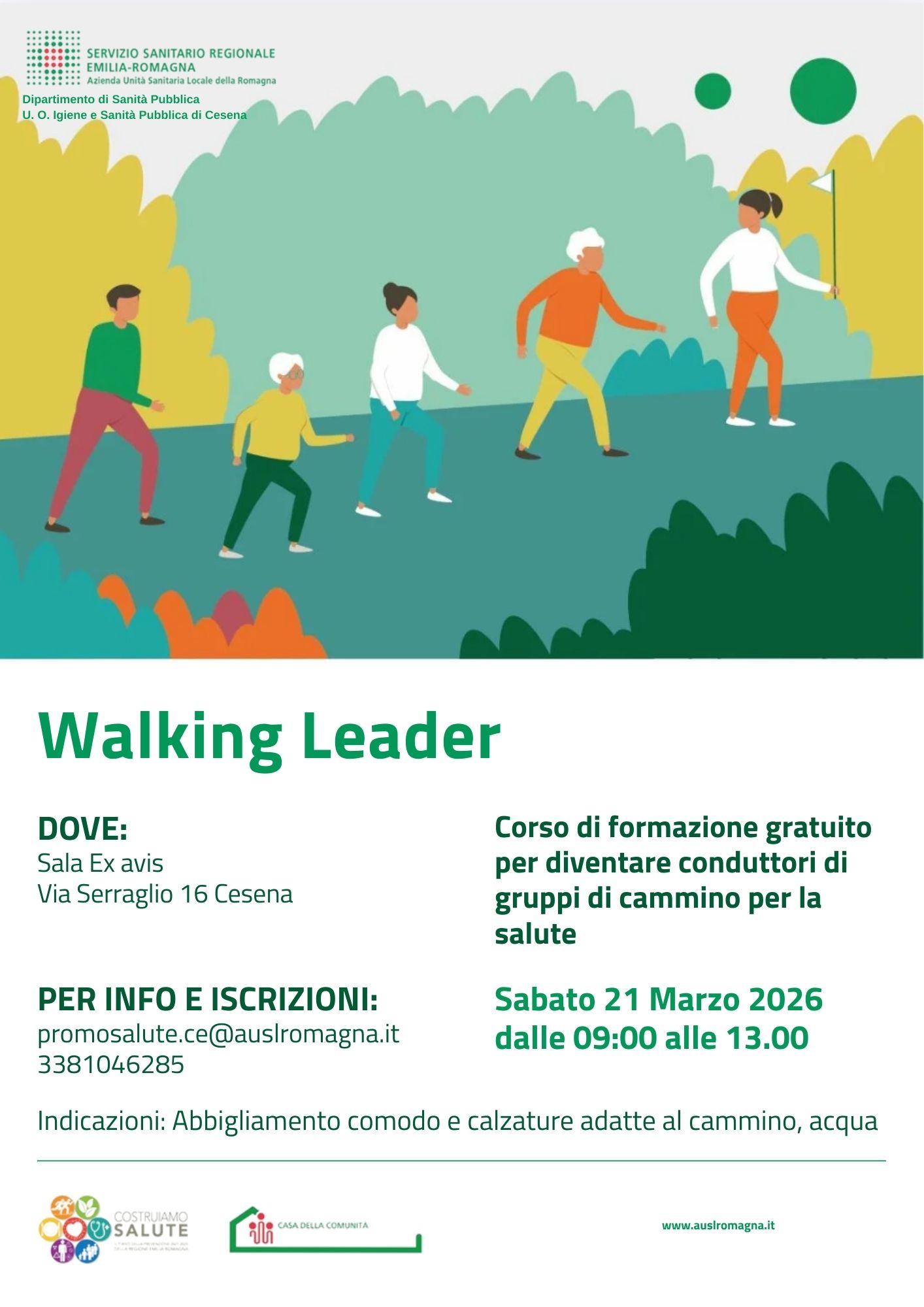 Proseguono anche le iniziative formative rivolte ai conduttori di gruppi di cammino (walking leader): a Cesena sabato 21 marzo dalle 9 alle 13 nella Sala Ex AVIS di via Serraglio 16, è in programma un nuovo corso gratuito di Primo Livello per “Conduttori di Gruppi di Cammino per la Salute". L’obiettivo del corso è quello di formare cittadini con competenze e conoscenze adeguate alla conduzione di un gruppo di cammino. Per avere più informazioni sui gruppi di cammino e sul ruolo del walking leader, è possibile consultare il sito regionale mappadellasalute.it