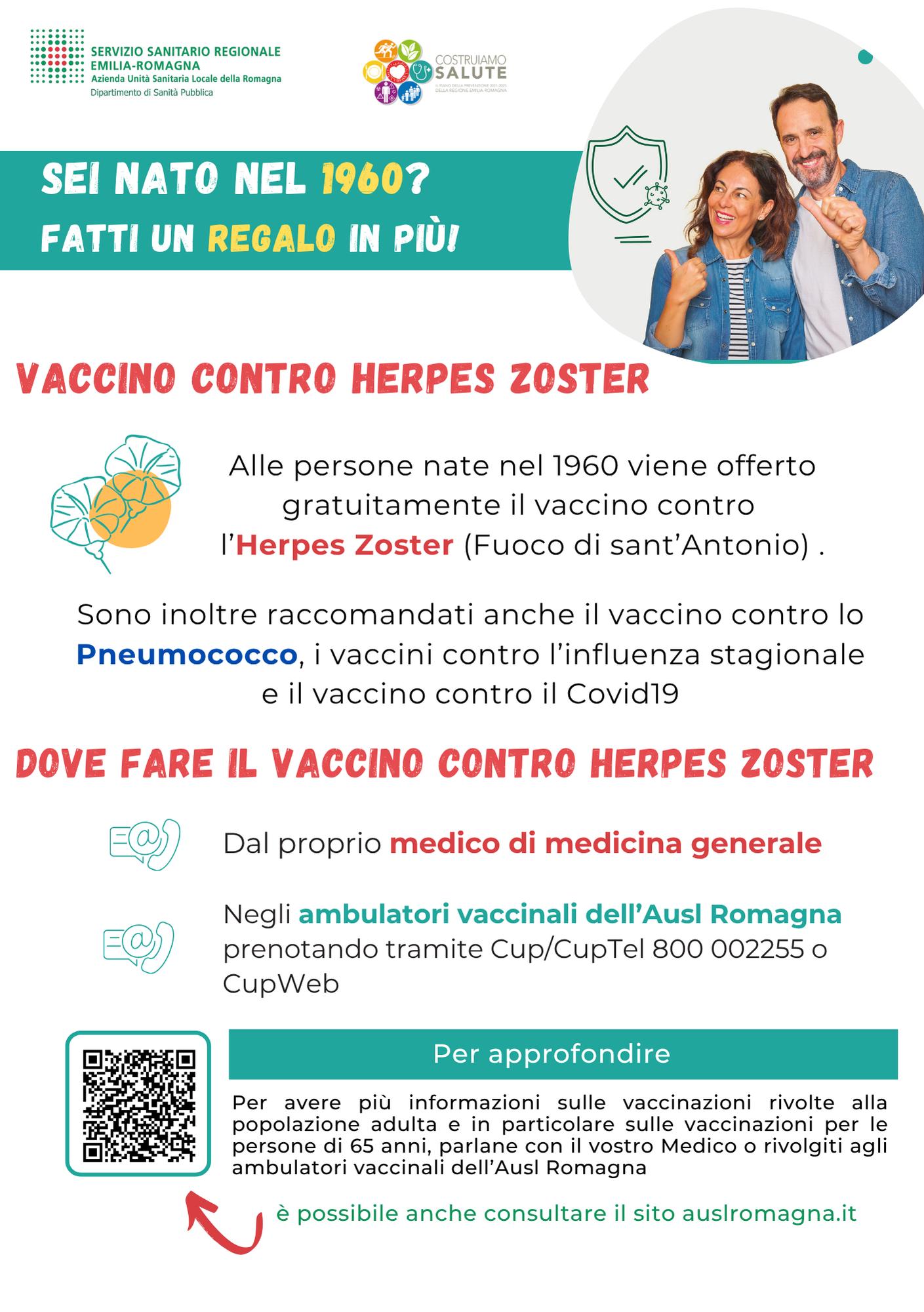 Continuano in Ausl Romagna le iniziative di promozione delle vaccinazioni previste dai Piano vaccinale nazionale e regionale. In particolare, nei giorni scorsi sono stati inviati messaggi tramite Fascicolo Sanitario Elettronico o SMS ai nati nel 1960 non vaccinati contro l’Herpes Zoster (Fuoco di Sant’Antonio) con l’invito a vaccinarsi contro questa pericolosa malattia.