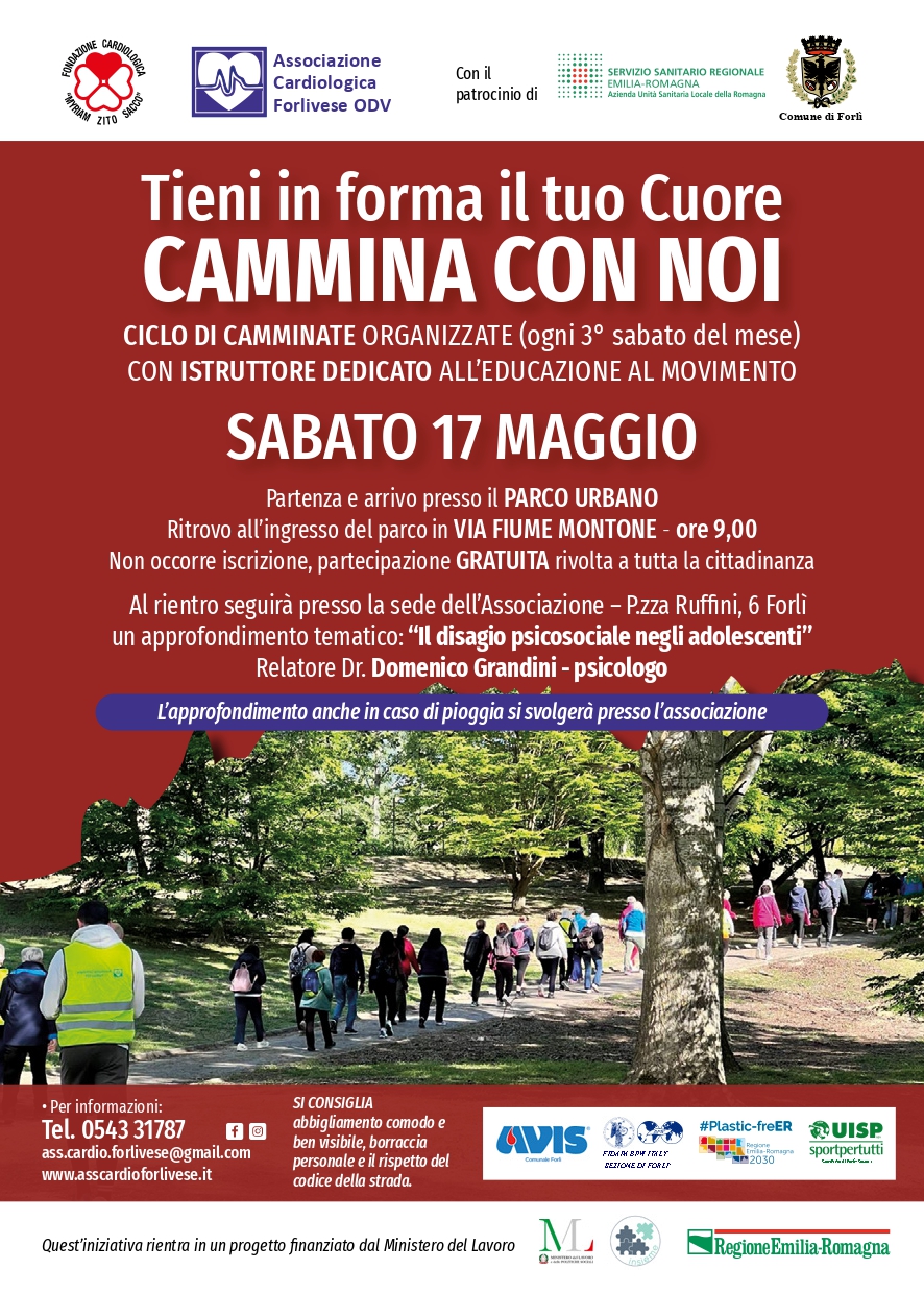 Prosegue il progetto “Cammina Con Noi” , proposto dall’Associazione Cardiologica Forlivese ODV e dalla Fondazione Sacco, per promuovere corretti stili di vita, di benessere psicofisico e socialità, mantenendo le finalità di carattere medico sulla prevenzione Cardio- Vascolare, con la camminata che si terrà sabato 17 maggio ore 9, presso il Parco Urbano" "Franco Agosto" di Forlì, (entrata via fiume Montone).