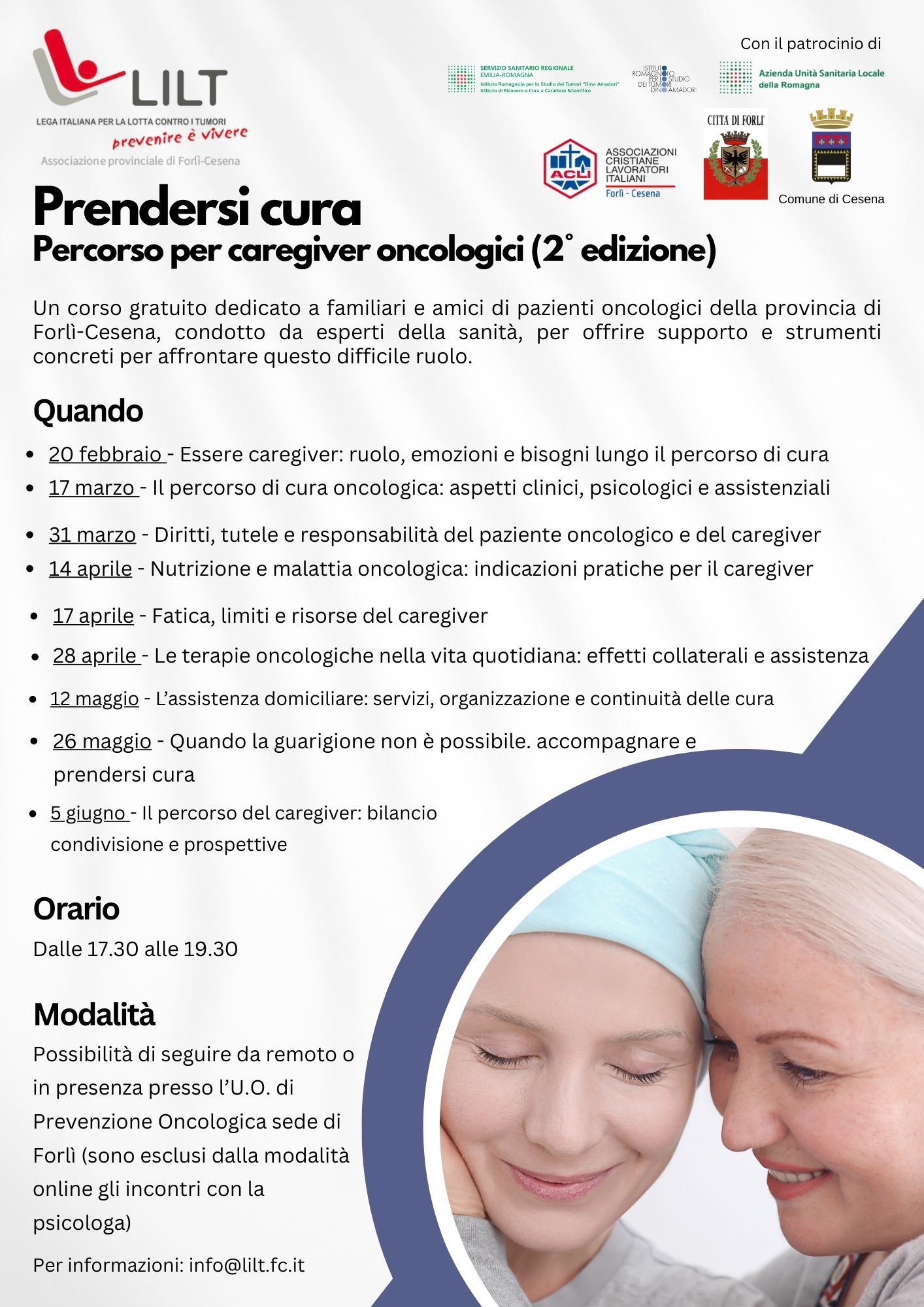 Il progetto è promosso da LILT Forlì-Cesena e realizzato con il patrocinio dell’Ausl della Romagna, Irst Irccs di Meldola, Comune di Forlì, Comune di Cesena e ACLI – Associazioni Cristiane Lavoratori Italiani Forlì-Cesena