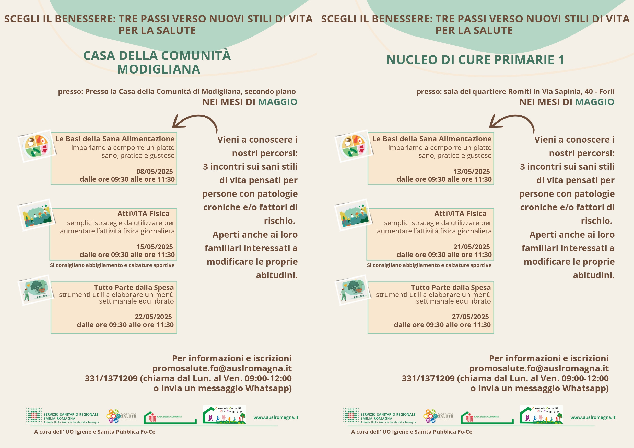 NB. Gli incontri sono gratuiti e hanno un numero di posti limitato. Per partecipare è quindi NECESSARIO ISCRIVERSI, inviando una e-mail a: promosalute.fo@auslromagna.it (indicando nome, cognome, data di nascita, telefono e iniziativa alla quale si è interessati), oppure telefonando, o inviando un messaggio WhatsApp al numero 331 1371209, dal lunedì al venerdì, dalle 9 alle 12.