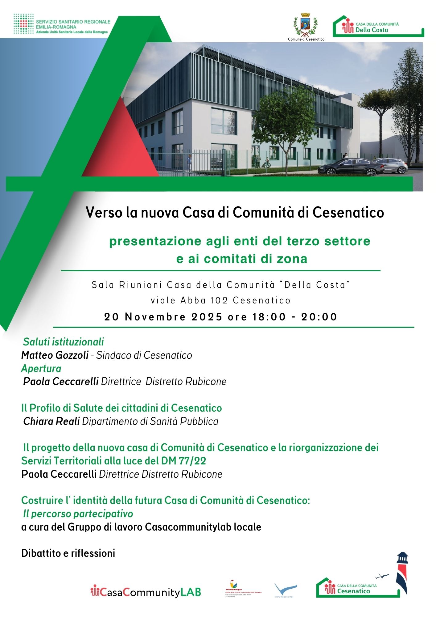Dopo il Saluto del Sindaco di Cesenatico Matteo Gozzoli, parleranno la direttrice del Distretto Rubicone Paola Ceccarelli, il medico di Sanità Pubblica di Forlì Cesena Chiara Reali e il Gruppo di Lavoro locale CasaCommunityLAB (CCLab). Sarà un buon punto di partenza per condividere esperienze e co-progettare idee e azioni per lo sviluppo della nuova Casa della Comunità.