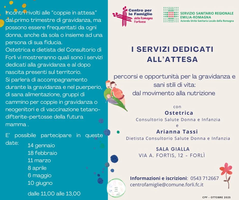 Il Consultorio Salute Donna Infanzia-Forlì, l’U.O. di Ostetricia e Ginecologia-Forlì, ed il Centro per le Famiglie della Romagna Forlivese offrono appuntamenti e percorsi per accompagnare e sostenere le donne e le coppie in attesa nel periodo della gravidanza e post partum.