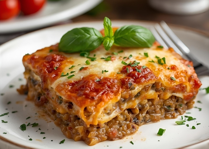 - Prendere una pirofila da forno, ungerla con l’olio evo, distribuire un velo di besciamella e alternare gli strati con ragù, sfoglia, mozzarella e parmigiano;